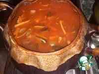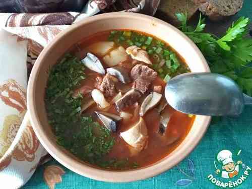 Довести до кипения, заложить грибы и пассерованные овощи, по вкусу посолить и поперчить. Томить похлебку в духовке до мягкости картофеля.