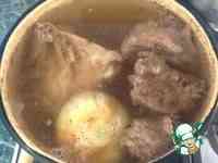 Разлить бульон по горшочкам, добавить картофель, нарезанный ломтиками и отправить в духовку.