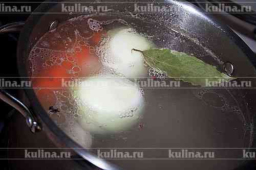 Когда мясо в бульоне будет готово, вытащить мясные продукты из него. Также выложить лук и морковь.