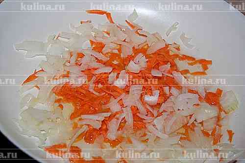 В это время на сковороду выложим сливочное масло. Оставшийся репчатый лук нарежем мелким кубиком и вместе с морковью, нарезанной соломкой поставим