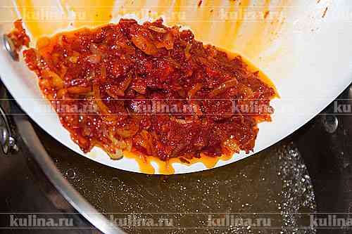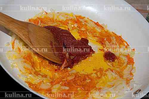 Когда овощи приобретут золотистый цвет, добавим томат-пасту.