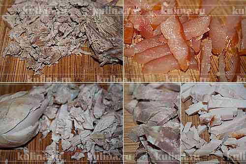 Сосиски, ветчину, мясо и мясо курицы нарезать соломкой и выложить к остальным ингредиентам. Закрыть крышкой и варить солянку еще около 15-20 минут.