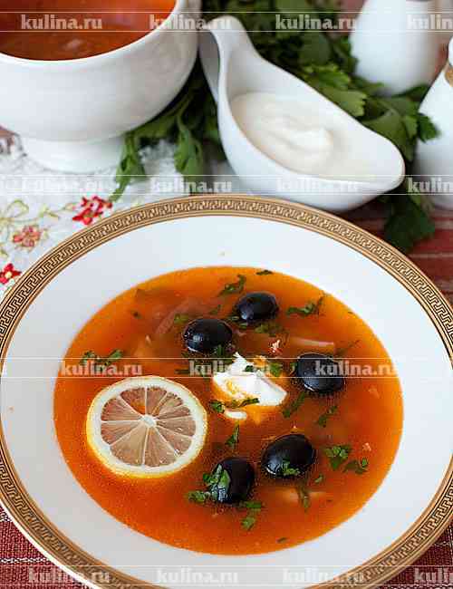 Подавать солянку в тарелку вместе с долькой лимона, маслинами или оливками и сметаной по вкусу. Украсить зеленью.