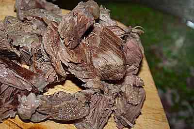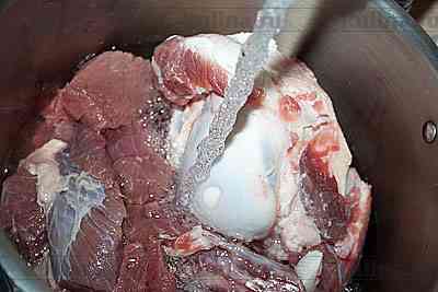 Варим бульон. Мясо с косточкой и мякоть баранины промыть, нарезать на небольшие куски, положить в кастрюлю, залить холодной водой.