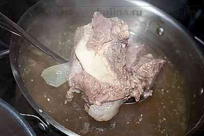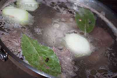 В бульон положить луковицу, перец горошком, лаврушку, немного посолить и варить бульон около 1,5 часов - пока мясо не станет мягким.