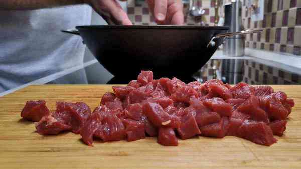Итак, режем мясо небольшими квадратиками и отправляем его в казан или подходящую кастрюлю, в которой можно обжаривать ингредиенты.