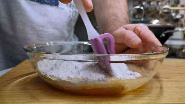 Затем всыпаем муку. Просеивать ее не нужно. Перемешиваем тесто сначала лопаточкой или ложкой.