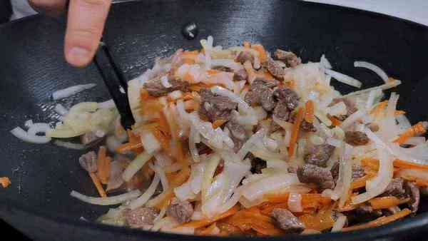 Затем отправляем в казан нарезанный репчатый лук и натертую морковь. Обжариваем все это еще около 5-ти минут. Огонь все время сильный.