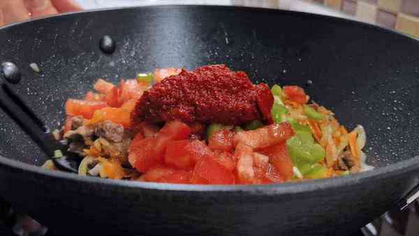 Далее идут сладкий болгарский перец и помидоры. Выкладываем их в казан и сразу добавляем томатную пасту.