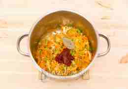 Морковь натрем на терке, сельдерей и лук нарежем (лук - полукольцами). Все вместе обжарим до мягкости на оливковом масле. Добавим томатную пасту и лавровый лист.
