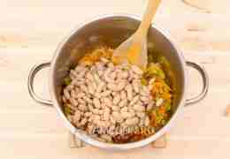 Из банки с фасолью сливаем жидкость, фасоль выкладываем в кастрюлю.