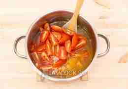 Заливаем содержимое водой и добавим нарезанные черри. Варим всё минуты три после закипания.