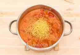 Затем добавим макароны по вкусу. Дело в том, что этот суп можно сделать и густым, добавив больше макарон. Проварим буквально одну минуту. Паутинка быстро готовится!