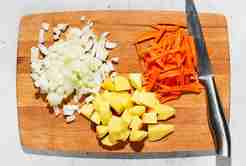 Подготовьте продукты для супа. Промойте чечевицу под струей холодной воды. Снимите шелуху с лука и чеснока, мелко порубите. Морковь порежьте соломкой. Очистите картофель и порежьте кубиками.