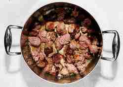 Разрежьте мясо на небольшие кусочки, переложите в кастрюлю с разогретым растительным маслом и жарьте, помешивая, на среднем огне 15–20 минут до золотистой корочки.