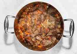 К говядине добавьте лук, чеснок и морковь, готовьте 7–10 минут. Помидоры надрежьте и опустите в миску с кипятком на 2–3 минуты. Переложите в холодную воду, снимите