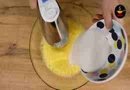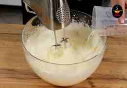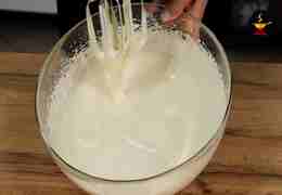 Взбивайте массу 5–7 минут до состояния пышной, светлой пены. Чем лучше взбиты яйца, тем нежнее будет пирог.