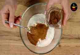 В отдельную миску просеиваем 250 г муки и добавляем к ней 2 ч. л. разрыхлителя, 1 ч. л. соды (без горки), щепотку ванилина, 2 ч. л. молотой корицы и 0,5 ч. л.
