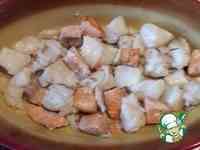 Рыбу порезать на крупные кубики, посолить, поперчить и быстро обжарить в растительном масле до полуготовности.