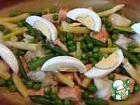 Яйцо отварить и порезать вдоль на 6 частей. Подготовить овощи. Я использовала замороженный зеленый горошек и смесь из зеленой и желтой стручковой фасоли.