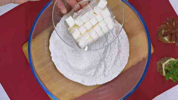 Выкладываем в эту смесь холодное сливочное масло, нарезанное кубиком.