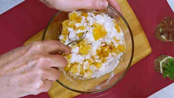 Режем апельсины кубиком и перекладываем вместе с соком в новую мисочку. Добавляем обычный и ванильный сахар и всыпаем немного муки.