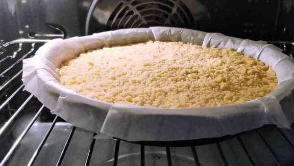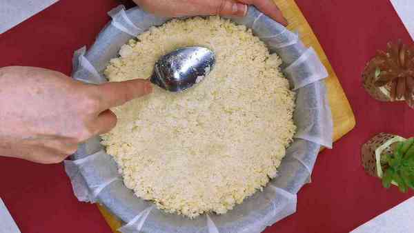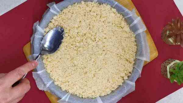 Насыпаем сначала ровно половину теста, разравниваем поверхность и слегка утрамбовываем.