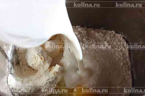 В чашу х/печки насыпать муку, соль, сахар, вбить яйцо, добавить размягченный маргарин. В теплом молоке растворить дрожжи, влить в чашу. Установить чашу в