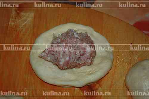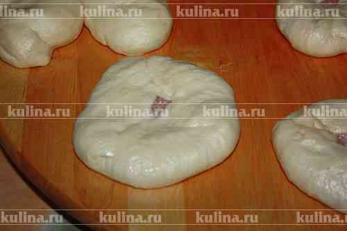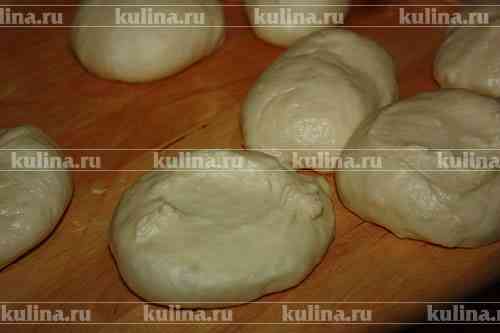 Подошедшее тесто вынуть из чаши на доску, смазанную маслом. Разделить тесто на шарики, каждый расплющить.