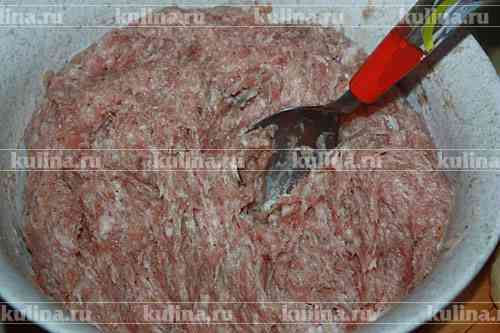 Свинину провернуть с луком через мясорубку, фарш посолить, поперчить, выбить.