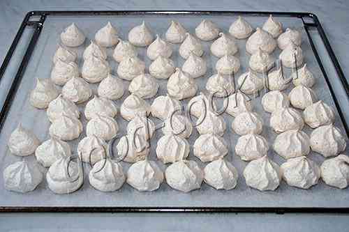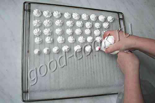 Формовка печенья Противень застелить бумагой для выпечки. Выложить белковую массу ложкой или выдавить её из мешка с насадкой-звёздочкой.