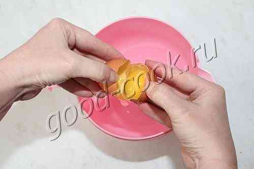 У яиц отделить белки от желтков. Желтки использовать в другом блюде. При отделении белка и желтка скорлупу яйца расколоть на две половинки и желток