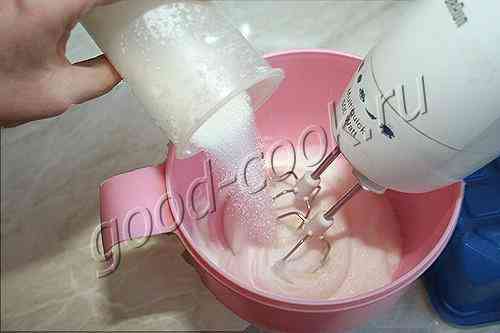У миксера выставить среднюю скорость вращения. Не прекращая взбивать прямо под лопасти очень тонкой струйкой всыпать сахар или сахарную пудру.