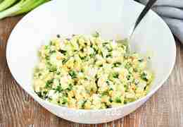 Лук отправляем в яйца, чуть солим и очень вкусная сочная начинка готова.