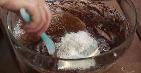 Смешиваем шоколадную массу с яичной с помощью миксера. Вмешиваем в тесто муку, добавляем соль.