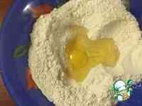 В 3 стакана муки вбиваем яйцо, добавляем масло растительное, соль, сахар, водку, оставшуюся воду, заваренную муку