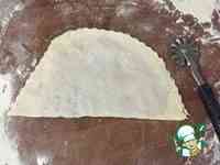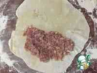Каждый кусочек тонко раскатываем ( стол слегка посыпаем мукой, тесто вберет нужное количество), на одну сторону кладем фарш