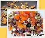 Орехи обжарить на сухой сковороде без масла. Сухофрукты и орехи измельчить ножом.