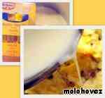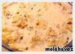 Духовку разогреть до 200° C. В огнеупорную емкость выложить смесь, положив на дно пару кусочков масла. Сверху равномерно распределить сливки.