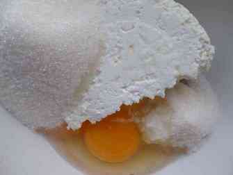 Для начинки в другой миске соединяем творог (его нужно отжать, если он слишком влажный), яйца, ванильный сахар и оставшийся сахарный песок (100 г).