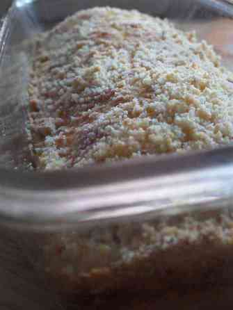 В огнеупорную форму выкладываем слои в таком порядке: 2/3 тестяной «крошки», разравниваем. На этот слой аккуратно выливаем начинку, разравниваем. А сверху