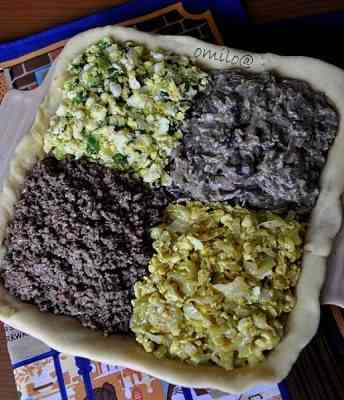 Мысленно разделить кулебяку на 4 равные части и разложить по «углам» начинки.