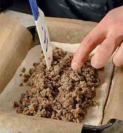 на противень, накрытый бумагой для выпечки. Выложите на тесто начинку из мясного фарша, оставив с каждой стороны поля по 4–5 см. Разровняйте и накройте блинами.