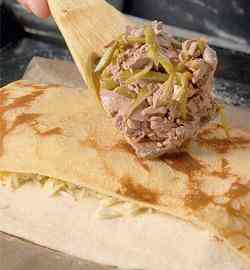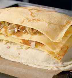 Выложите по очереди начинки, перекладывая слои блинами. Раскатайте второй пласт.