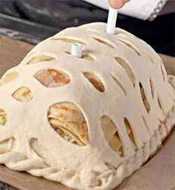Воткните 2 трубочки из пергамента для выхода пара. Дайте кулебяке расстояться 20 мин., смажьте слегка взбитым желтком. Выпекайте 45 мин. при 190° C.Источник: gastronom