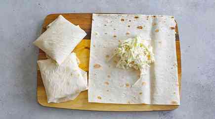 Листы лаваша разрежьте на квадраты со стороной 20 см. На каждый квадрат выложите часть творожной начинки и сверните конвертом.