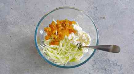 Смешайте творог с сахаром, разотрите вилкой или пробейте погружным блендером. Соедините творог, яблоко и изюм и перемешайте.