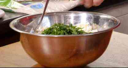 Солим, перчим и добавляем мелко нарезанную кинзу, петрушку и базилик. Добавляем немного растительного масла и тщательно перемешиваем.