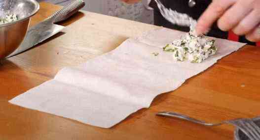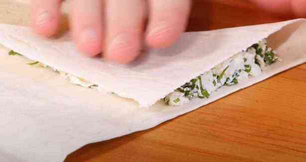 Лист лаваша нарезаем длинными прямоугольниками. Наискосок в угол выкладываем начинку.