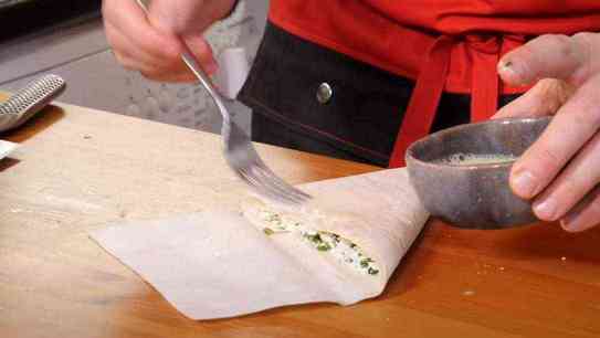 и складываем конвертиком. Чтобы лаваш крепко держался и не разваливался, смазываем яйцом.
